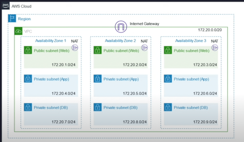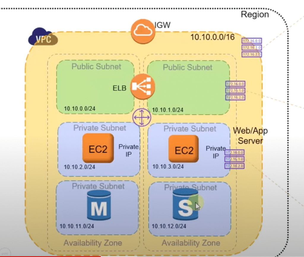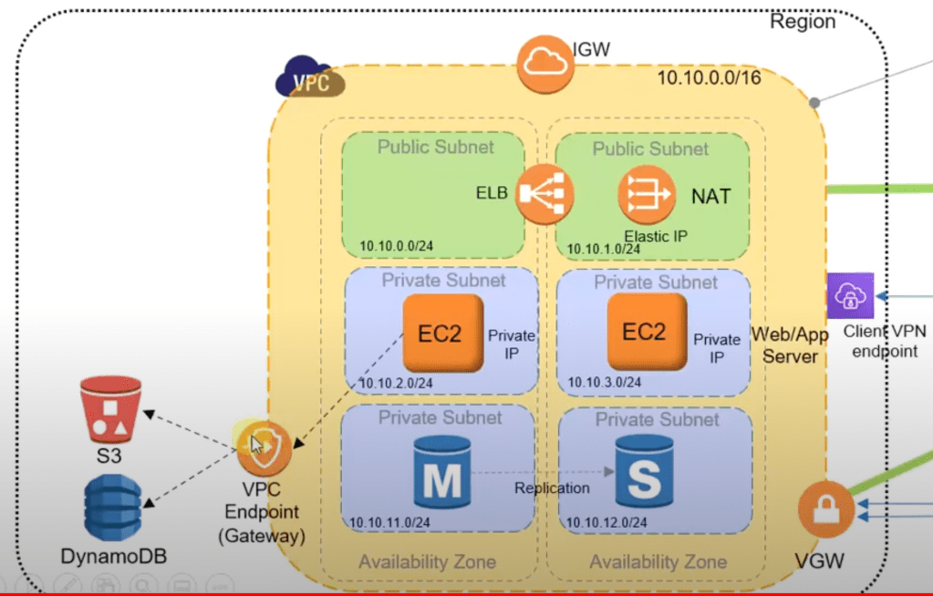 In this example you have a VPC in 1 Region across 2 AZs. You can see that they’ve setup public subnets (to connect to the Internet) and private subnets (for EC2 instances and to host a DB with private information). The IGW (Internet Gateway) is attached to the VPC; the Internet Gateway is controlling incoming & outgoing traffic and allows the VPC to communicate with the Internet.